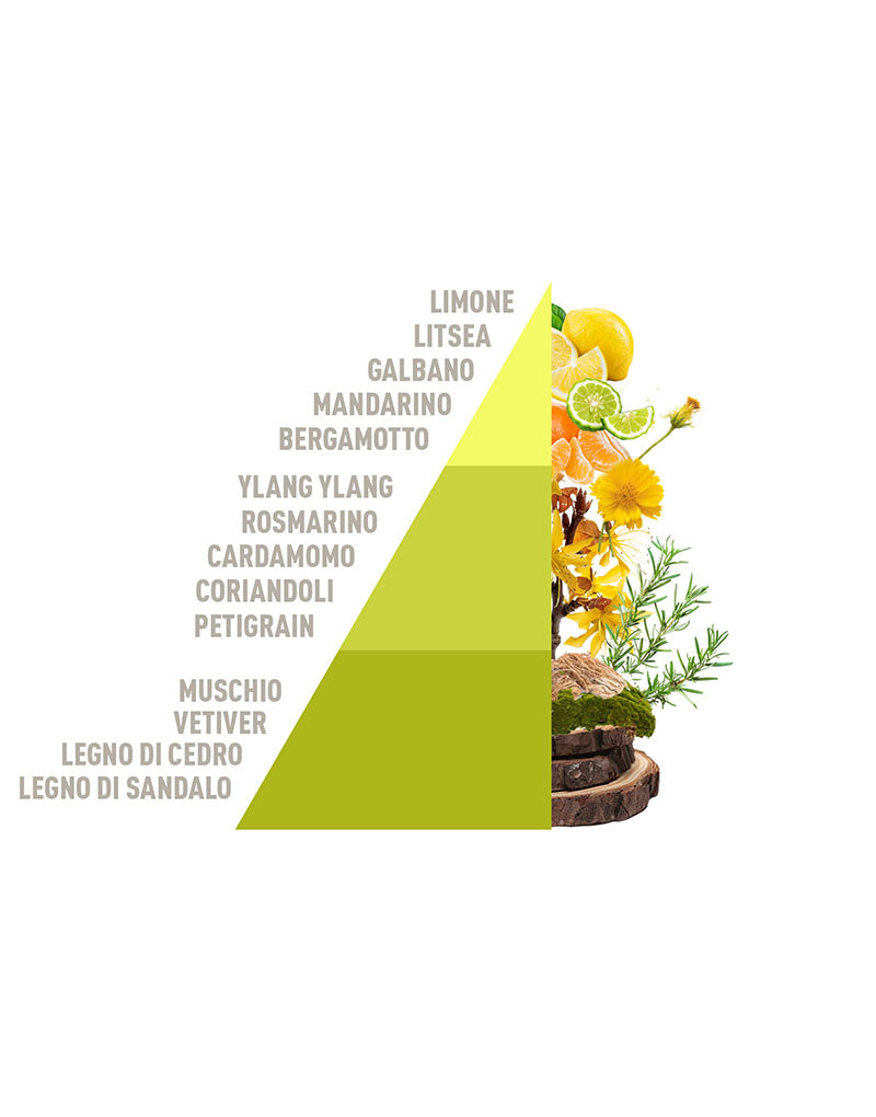 Un viaggio sensoriale che si apre con l'energia vibrante del limone e del mandarino, intrecciati alla freschezza aromatica del galbano e del rosmarino. Le note floreali di ylang ylang e il tocco speziato del coriandolo sfumano in un abbraccio caldo e avvolgente di muschio e sandalo. La purezza naturale degli ingredienti come il cardamomo e il legno di cedro, unita al fascino degli agrumi, crea un'esperienza olfattiva luminosa e rigenerante.